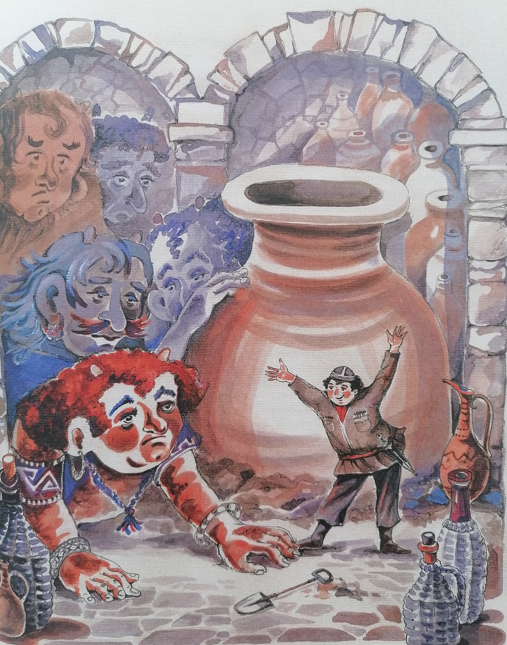 Көлөргеч зур чүмечне көчкә-көчкә генә сөйрәп алып чыккан, чыккан да кире керми генә, ди. Ә диюләр эчемлек көтәләр, ләкин көтөп ала алмыйлар икән. Ишегалдына карасалар, ни күзләре белән күрсеннәр: Көлөргеч тимер көрәк алган да җирдәге чанны казып маташа, ди.