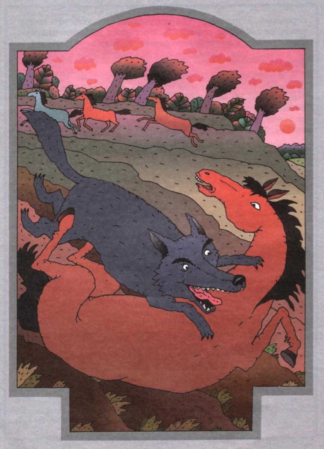 А к утру отстали от табуна еще три лошади. И им тоже пришлось вспомнить слова вожака. Скачут лошади, вдруг — серый волк. Не помня себя, разбежались они в разные стороны. Набросился волк на одну лошадь, схватил ее зубами за горло, повалил и загрыз. Остальные лошади побежали к табуну. Рассказали они все Рыжей и покаялись.