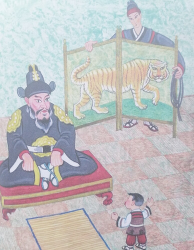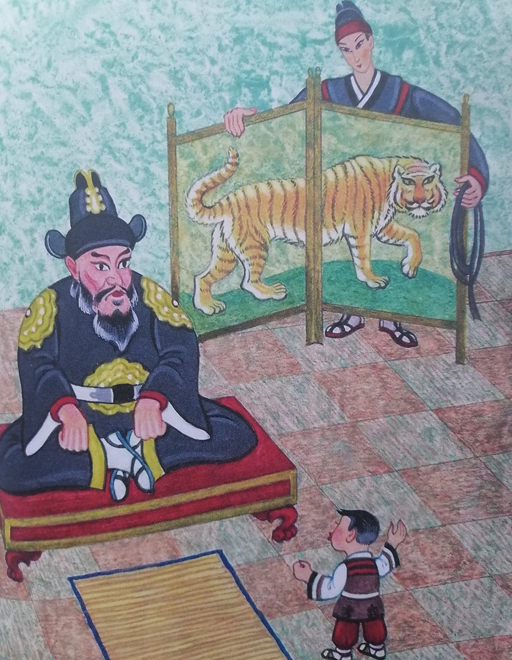 Башлык хезмәткәрләренә юлбарыс рәсеме төшкән ширма белән бау китерергә кушкан, аннары малайга эндәшкән: