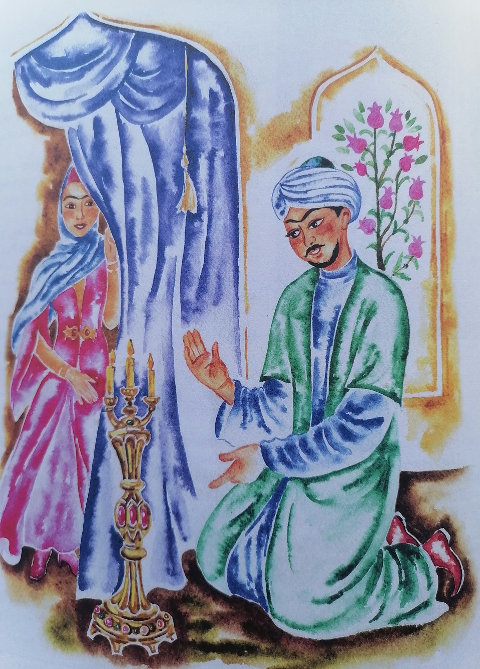 Табиб, юлдашын да алып, кыз янына кереп китте. Патша, вәзирләрен ияртеп, бо- ларны күзәтергә ашыкты. Табиб, кыз янына керсә дә, аңа һич сүз катмады. Бүлмәдә якутлар белән бизәлгән матур алтын шәмдәл тора икән. Шәмдәлгә борылып болай диде: